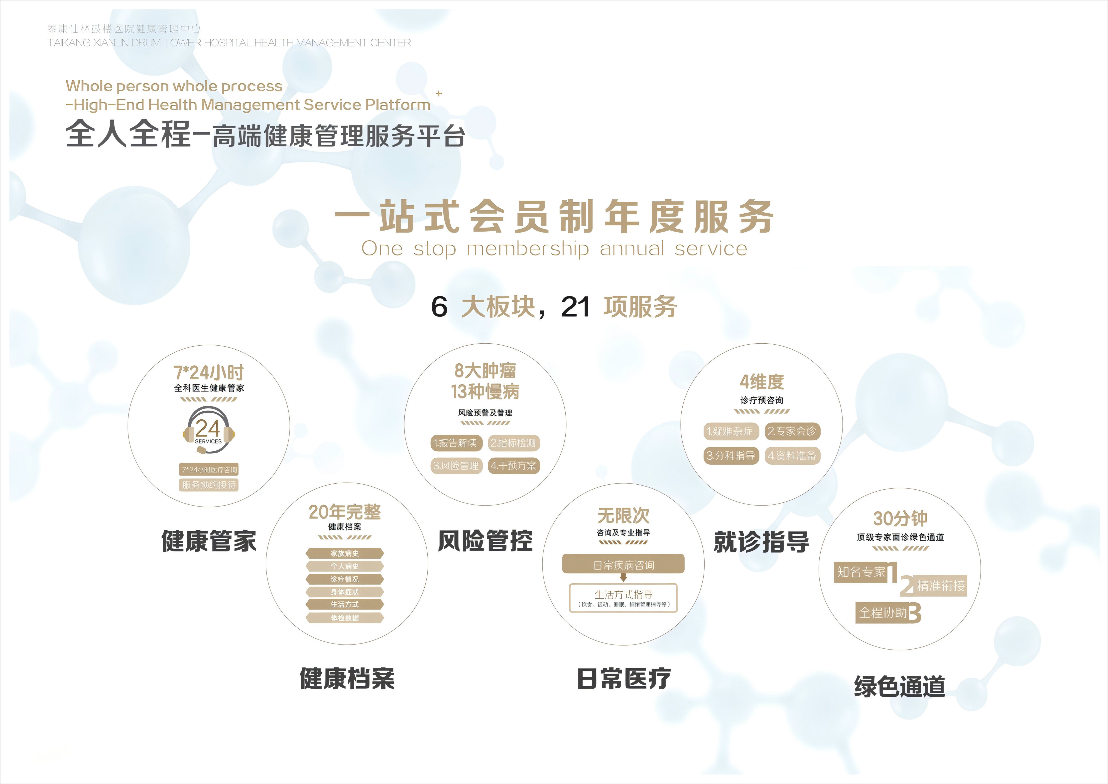 健康管理中心的一站式會員制年度服務(wù)。包括健康管家、風(fēng)險管控、就診指導(dǎo)等多個方面,為會員提供6大板塊21項健康管理服務(wù)。