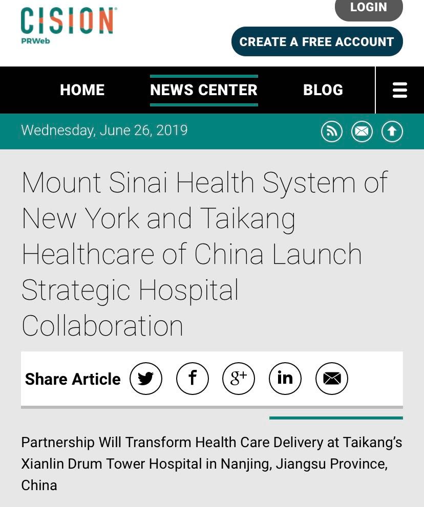 CISION刊登我院與西奈山醫(yī)院建立戰(zhàn)略合作關(guān)系
