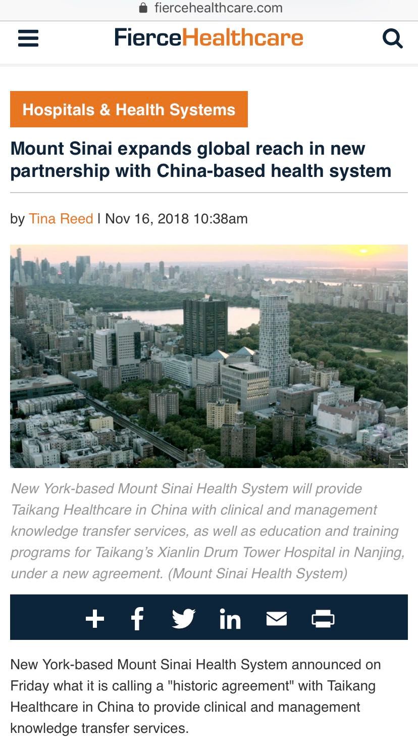 FierceHealthcare刊登我院與西奈山醫(yī)院達(dá)成合作